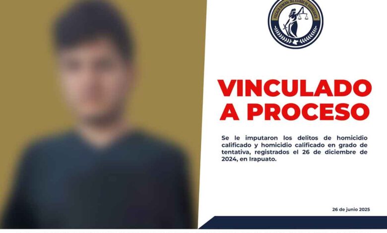 Tras la presentación de pruebas ante la jueza y los argumentos del Ministerio Público, se determinó vincularlo a proceso penal por los delitos de homicidio calificado y homicidio calificado en grado de tentativa, para que enfrente la justicia por estos hechos que cobraron la vida de un joven e hirieron a otro.