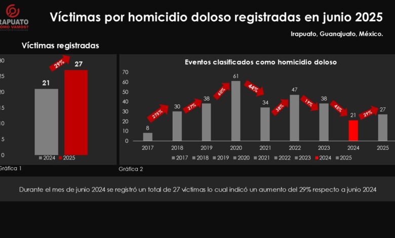 Irapuato, Gto. 2 de julio del 2025. (asviknoticias.com).- Durante el mes de junio de 2025  en Irapuato se registraron 27 víctimas por homicidio doloso, que represento un aumento del 29% con respecto a junio de 2024.